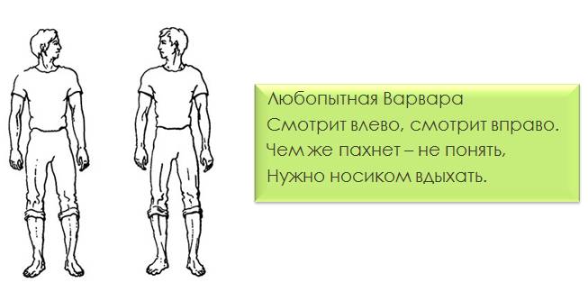 Следует встать прямо, ноги на ширине плеч. Поочередно поворачивать голову в стороны и делать резкий вдох. Плечи при этом должны быть расслаблены и неподвижны.