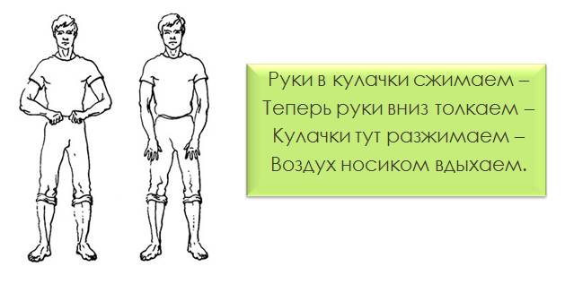 Надо встать прямо, сжать кулаки и прижать их к поясу. При вдохе с силой толкать кулаки к полу, разжимая их. На выдохе принять первоначальное положение. После 4 вдохов следует отдых на протяжении 3-5 секунд.