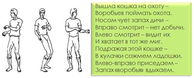 Ноги должны быть на ширине плеч, руки опущены. Надо слегка присесть вправо и немного повернуться в ту же сторону, «охотясь» на добычу обеими руками на уровне пояса. Движения сопровождаются вдохом, на выдохе следует возвратиться в исходное положение и проделать те же действия при повороте в другую сторону.