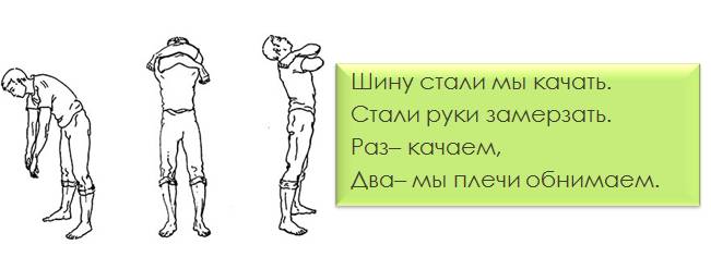Это упражнение состоит из двух ранее рассмотренных — «насос» и «обними плечи». Сначала вдох производится в наклоне вперед, при распрямлении происходит выдох, далее — вдох в тот момент, когда руки «обняли» плечи. При расхождении рук выдох пассивный.
