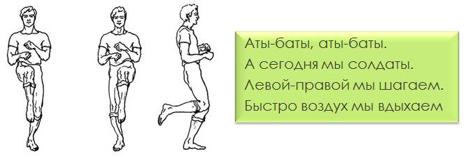 Встать следует прямо, руки опустить вниз. Надо начать ходьбу на месте, делая вдох на каждый шаг. Можно делать передние шаги (колено сгибается, и нога выводится вперед, вторая нога тоже немного согнута) или задние (согнутая нога отводится назад).