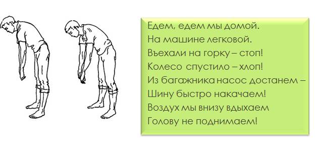 Встать следует сначала прямо, ноги расставить в стороны на расстояние чуть меньше ширины плеч, затем слегка наклониться вперед, руки свесить вниз. Начать «накачивать шину»: немного наклониться вперед и сделать вдох, возвратиться в слегка согнутое положение и произвести пассивный выдох.