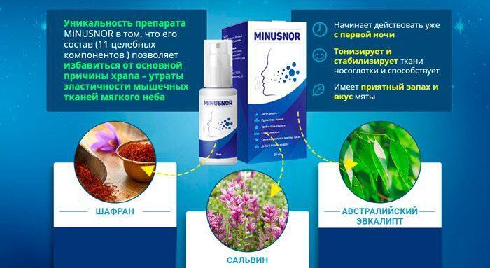 Продукт устраняет неприятные симптомы уже после первого применения, способствуя увлажнению мышечной ткани мягкого нёба и устранению спазмов гортани. Minusnor является эффективным средством против апноэ, предотвращая задержку дыхания во время храпа.
