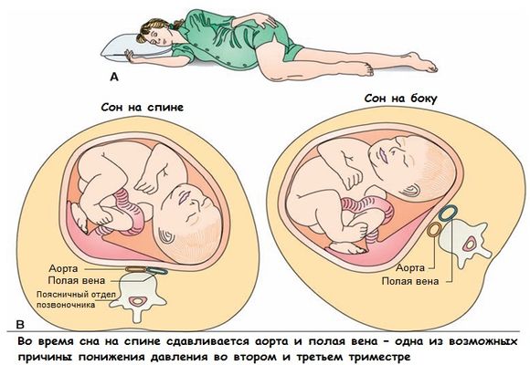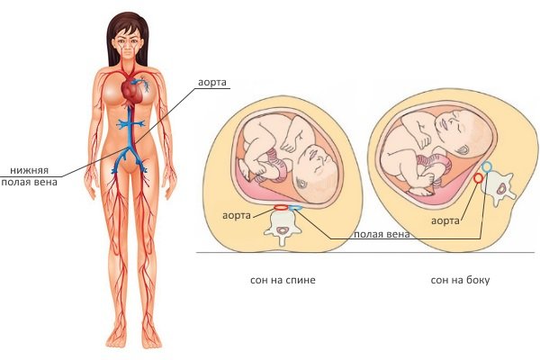 Описанные выше осложнения происходят из-за того, что при сне на спине увеличившаяся матка прижимается к позвоночнику, сдавливая нижнюю полую вену и аорту (см. рисунок 1). Пережим нижней полой вены, которая несёт кровь от нижних конечностей вверх к сердцу, вызывает уменьшение возврата венозной крови к сердцу, и артериальное давление женщины понижается, кровь в венах застаивается, снижается маточный и почечный кровоток.