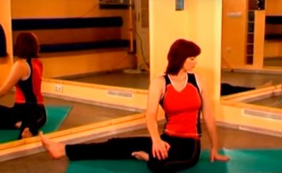 2.Останьтесь лежать на коврике. Руки раскинуты, плечи опущены, ступни прижаты к поверхности пола. Таз подается влево. Вдохните, а на выдохе колени уходят вправо и тянутся к полу. В это время голова повернута в противоположную сторону. В этом положении необходимо пробыть около пятнадцати секунд, потом поменять сторону