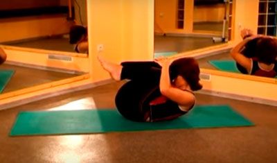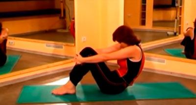 4.Ноги вместе, притянуты к груди. Ладонями обнимите коленки. Вдохните, во время выхода лбом коснитесь коленей. Через пару секунд опуститесь на пол.