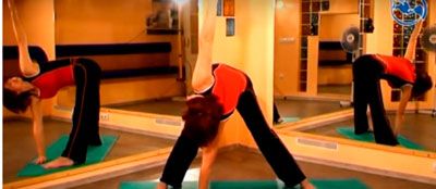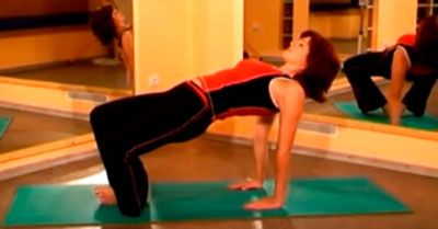 - Теперь руки необходимо выпрямить, опереться на пол ладонями. На вдохе спину прогибаем книзу, голову запрокидываем. На выдохе позвоночник выравниваем.