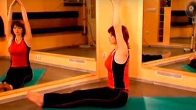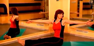 - «Поза половины лодки». Укладываемся на спину, ноги сгибаем в коленях, голову и плечи приподнимаем кверху, руки вытягиваем вперед, поясницу прижимаем к полу. Затем выпрямляем колени, держа ноги на весу.