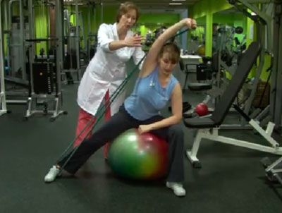 1.Сядьте на фитбол. Специальную резиновую ленту сверните вдвое и накиньте одним концом на правую стопу, а ногу отставьте в сторону. Второй конец ленты зажмите в правой руке. Локтем левой руки обопритесь на левое колено. На выдохе правая рука выпрямляется вверх по диагонали. Сделайте 15–20 повторов обеими руками.