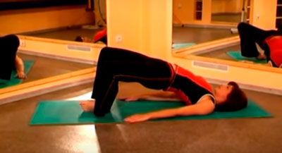 - В положении лежа на спине поместите руки вдоль туловища, на выдохе поднимите таз, на вдохе опустите его. Повторите десять раз.