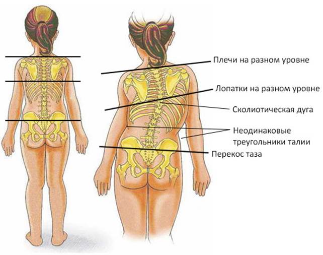 - При осмотре следует оценивать симметричное расположение лопаток и плеч, степень вогнутости и выпуклости позвоночного столба, равномерность треугольников талии.