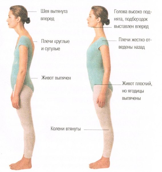 Правильная осанка выглядит следующим образом. Голова высоко поднята, подбородок выставлен вперёд. Корпус выпрямлен. Грудная клетка развёрнута, плечи расположены на одном уровне и немного отведены назад.