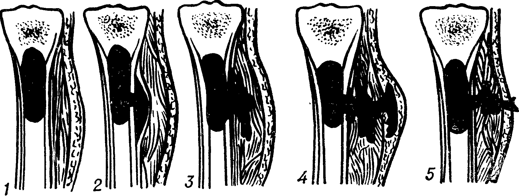 Дальнейшее течение заболевания типично: патогенная микрофлора начинает активно размножаться в костномозговом канале с формированием воспаления и гноеобразованием. При этом повышается внутрикостное давление. Дальнейшее распространение гноя может производиться несколькими путями: