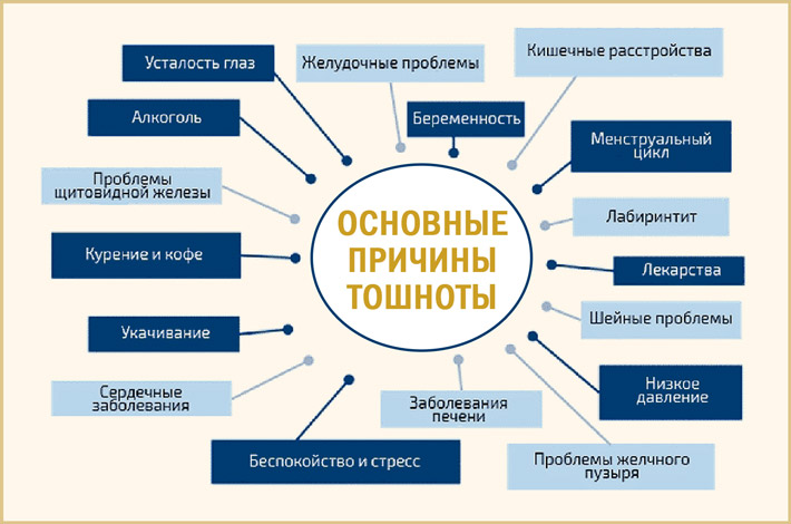 Возникновение тошноты происходит по многим причинам. Основной из них является раздражение чревного и блуждающего нервов. При этом снижается тонус стенок желудка, замедляется перистальтика.
