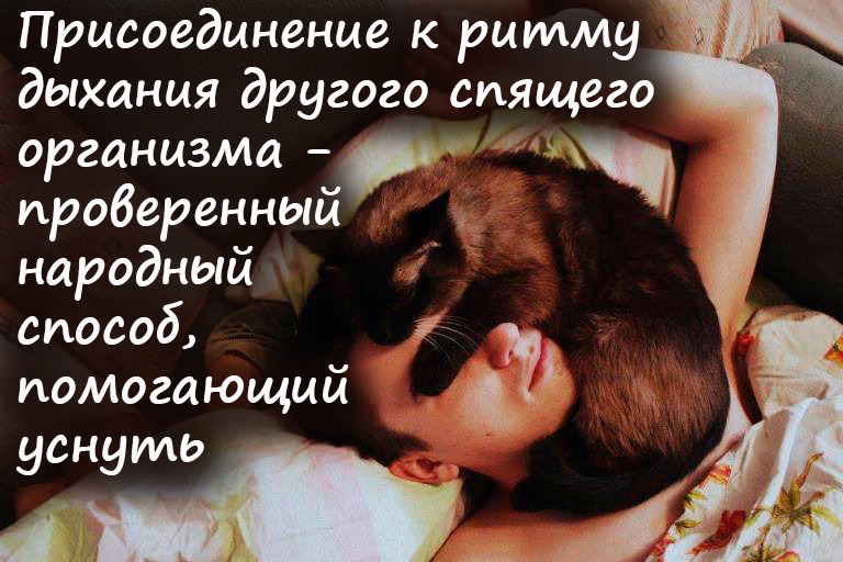 Присоединение к ритму дыхания другого спящего организма (это может быть под боком домашняя кошечка или собачка, или жена (муж). Если смогут выдержать ваш перегар и не сбегут подальше. Способ очень эффективен. Часто помогает мурчание кошки, если нет шумобоязни.