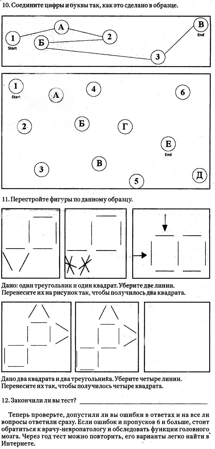 Продолжительность выполнения — 3-4 минуты, количество пунктов — 6. Оценка инвертирована — при меньших нарушениях исследуемый зарабатывает меньшее количество баллов. Результаты: от 0 до 7 — отсутствие патологии, 8-9 — умеренные нарушения, 10-28 — выраженные расстройства мозговых функций, требуется более глубокое обследование.