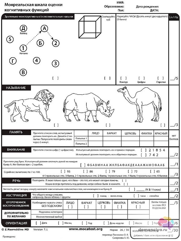 Если у человека деменция, тест выдаст 20 и менее баллов. Этот результат считается тревожным и требует дальнейшей диагностики.