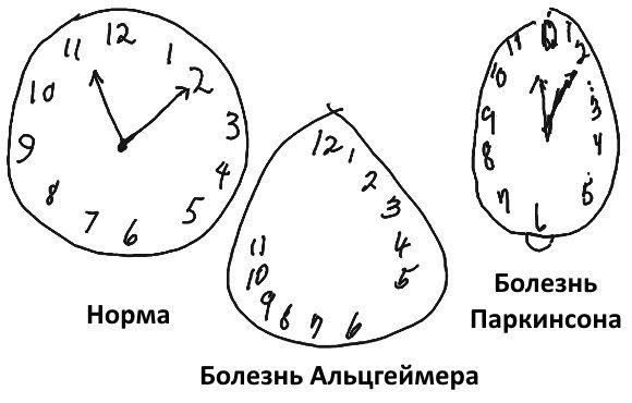 Наиболее популярный вариант определения слабоумия. Во время тестирования пациенту задают нарисовать циферблат часов, в котором стрелки будут показывать определенное время. В зависимости от результатов ставят от одного до десяти баллов.