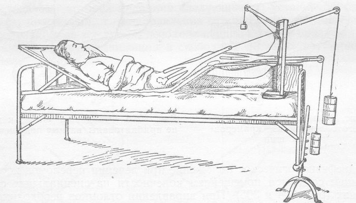 - На голень и бедро с помощью лейкопластыря фиксируются ленты, к которым прикреплены небольшие грузы – осуществляется вытяжение.