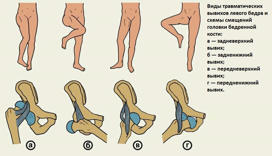 Согласно классификации, выделяется четыре отдельных варианта вывиха в тазобедренном суставе. Они характеризуются различным смещением головки бедренной кости по отношению к плоскости вертлужной впадины. В каждом случае нижняя конечность принимает особенное положение, что нередко позволяет определить вариант только внешнему виду ноги.