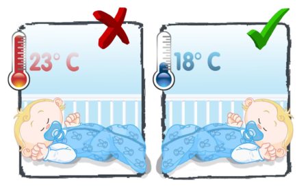 Родители нередко стараются слишком сильно нагреть воздух в спальне, из-за чего спать в ней становится некомфортно. Вечером помещение проветривают (ребенка предварительно убирают). Ориентируются на то, что температура во время сна должна быть не более 22 градусов.
